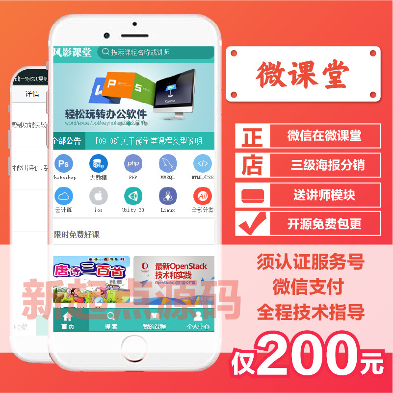 微课堂拥有完整的在线付费课程和内置三级分销模式。微课堂的课程主要分为三种,即免费课程,指所有的会员都可以参与免费学习;VIP会员免费课程,指该课程只需要用户开通会员VIP服务后即可免费观看;付费课程,所有用户需付费购买后方可观看。免费课程是/吸引用户的渠道之一,管理员可通过不定期开放部分限时免费课程来吸引用户。