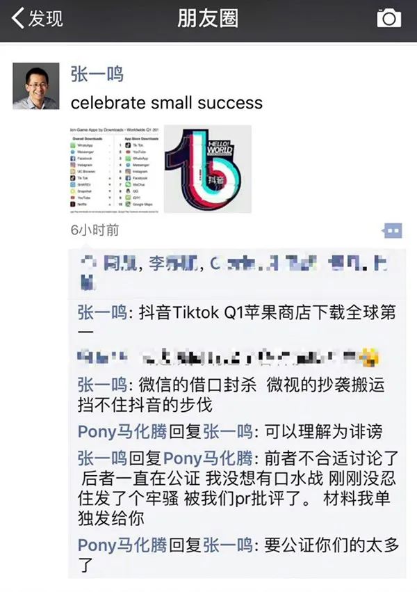 直至5月7日晚间,两方冲突达到巅峰。当晚,张一鸣和**在朋友圈隔空“互怼”。张一鸣称:“微信借口封杀,微视的抄袭搬运挡不住抖音的步伐”。**则回复称,“可以理解为诽谤”。