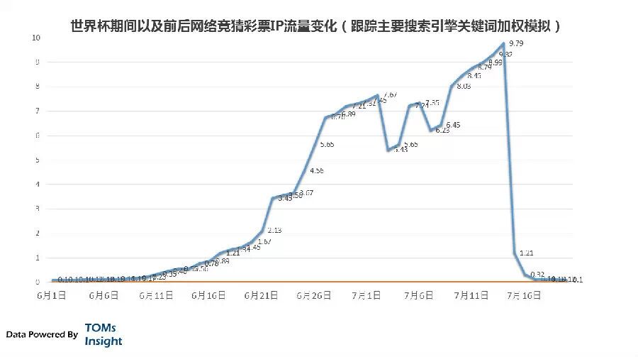但是世界杯只是一个营销红利,在中国的**需求处于长期压抑的状态情况下,世界杯期间的竞猜类彩票销售情况并不能说明什么趋势和前景,也并不能意味着又多么美妙的趋势,如果就此来讲述“从此用户消费使用习惯养成”的故事等等,就更可笑了。我们从下面的流量曲线可以看出来,世界杯结束后,需求立刻回到了原点。