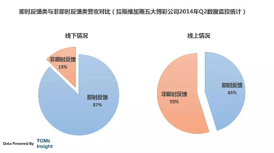 互联网作为彩票的销售渠道,是典型的利用流量切入传统行业。我们可以看到下图,跟踪拉斯维加斯的最大的5个**公司的线上线下销售数据,线上销售主要以非即时反馈为主(彩票类,**球类),而作为**游戏类,网络的体验完全就不如亲临其境了。通过网络销售彩票已经是**业的一个常态。