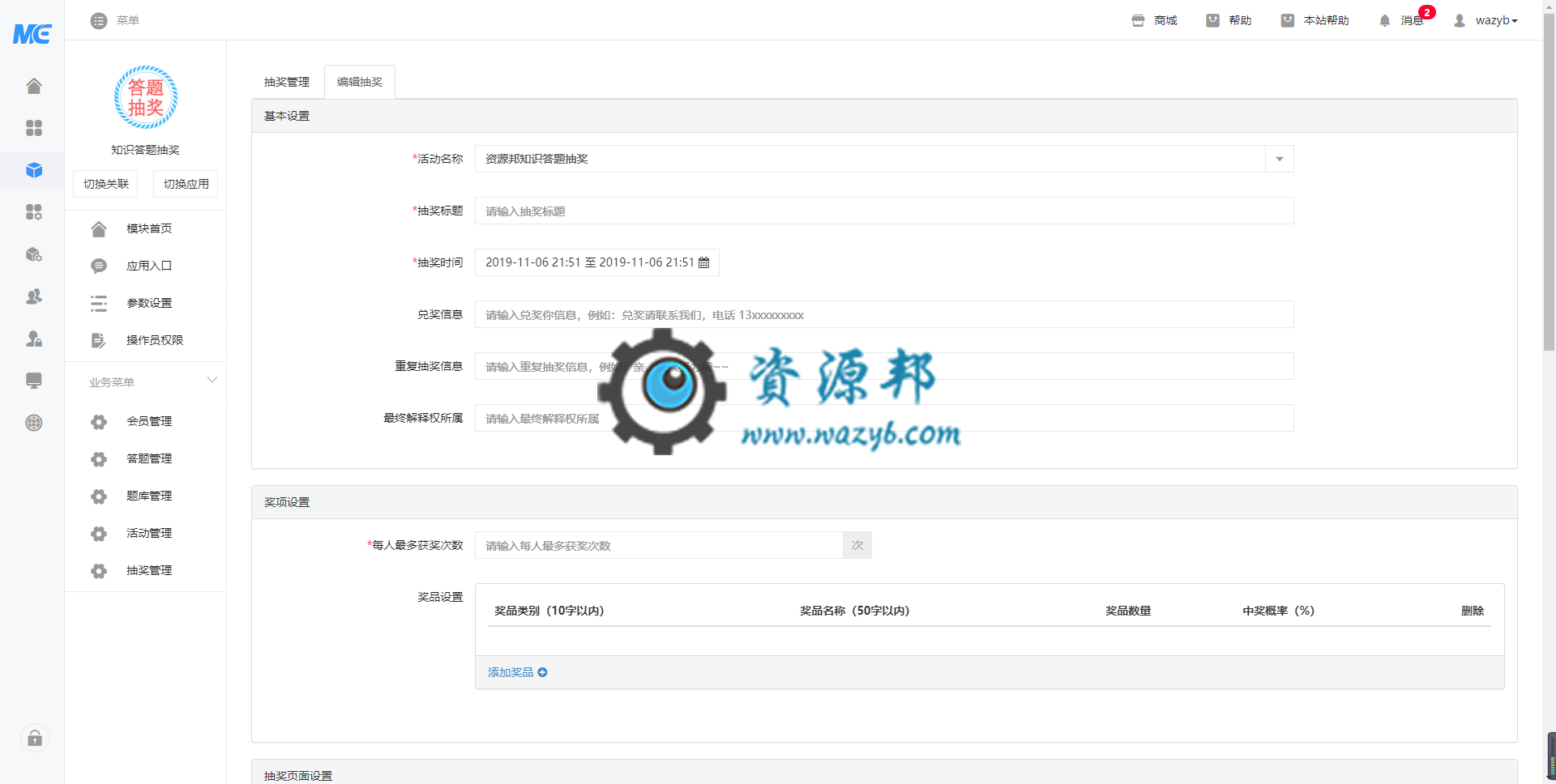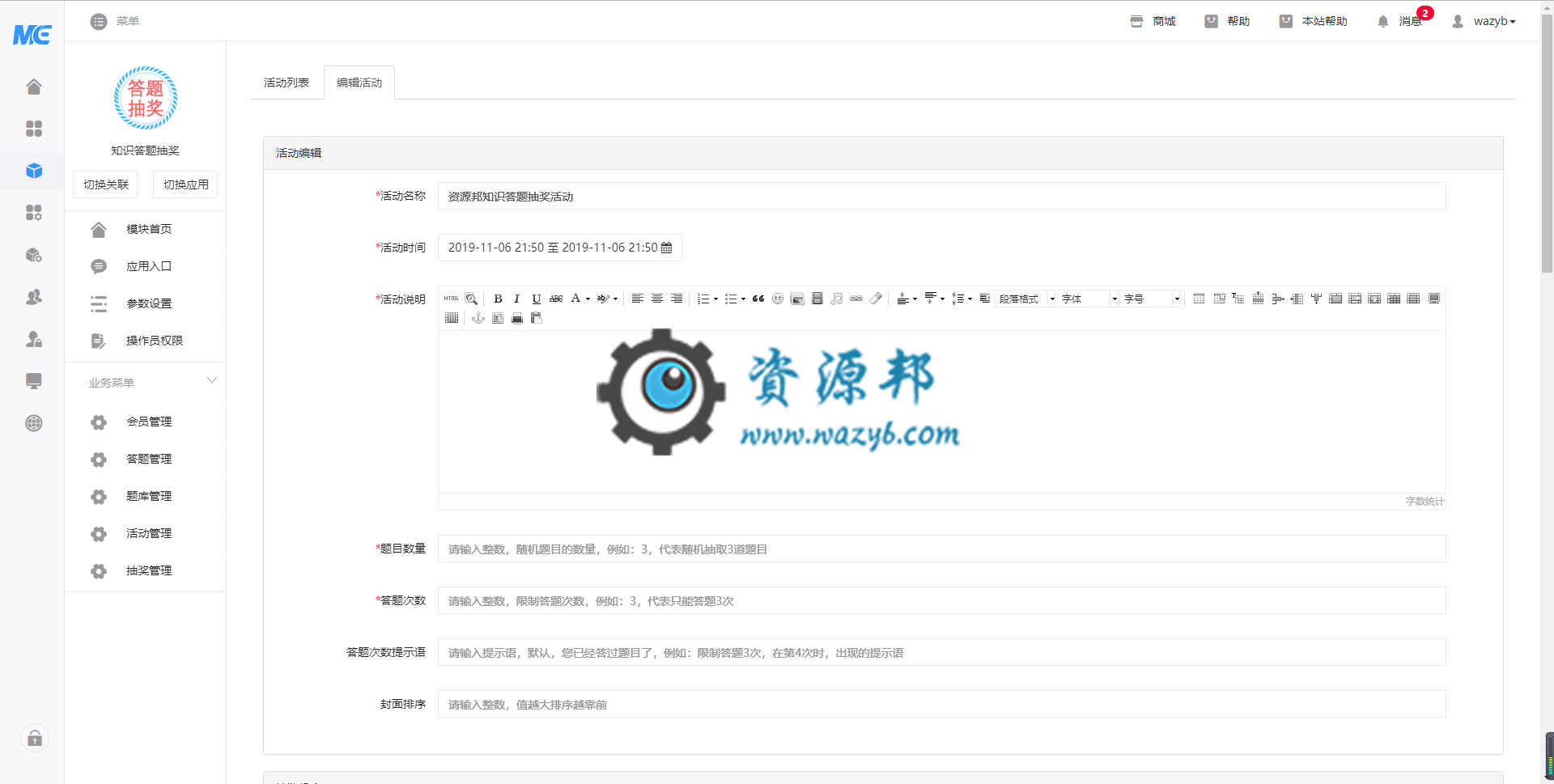每个答题活动,自定义本次活动随机抽取题目的数量,自定义限制答题次数,抽奖设置,自定义各种背景,自定义分享内容。