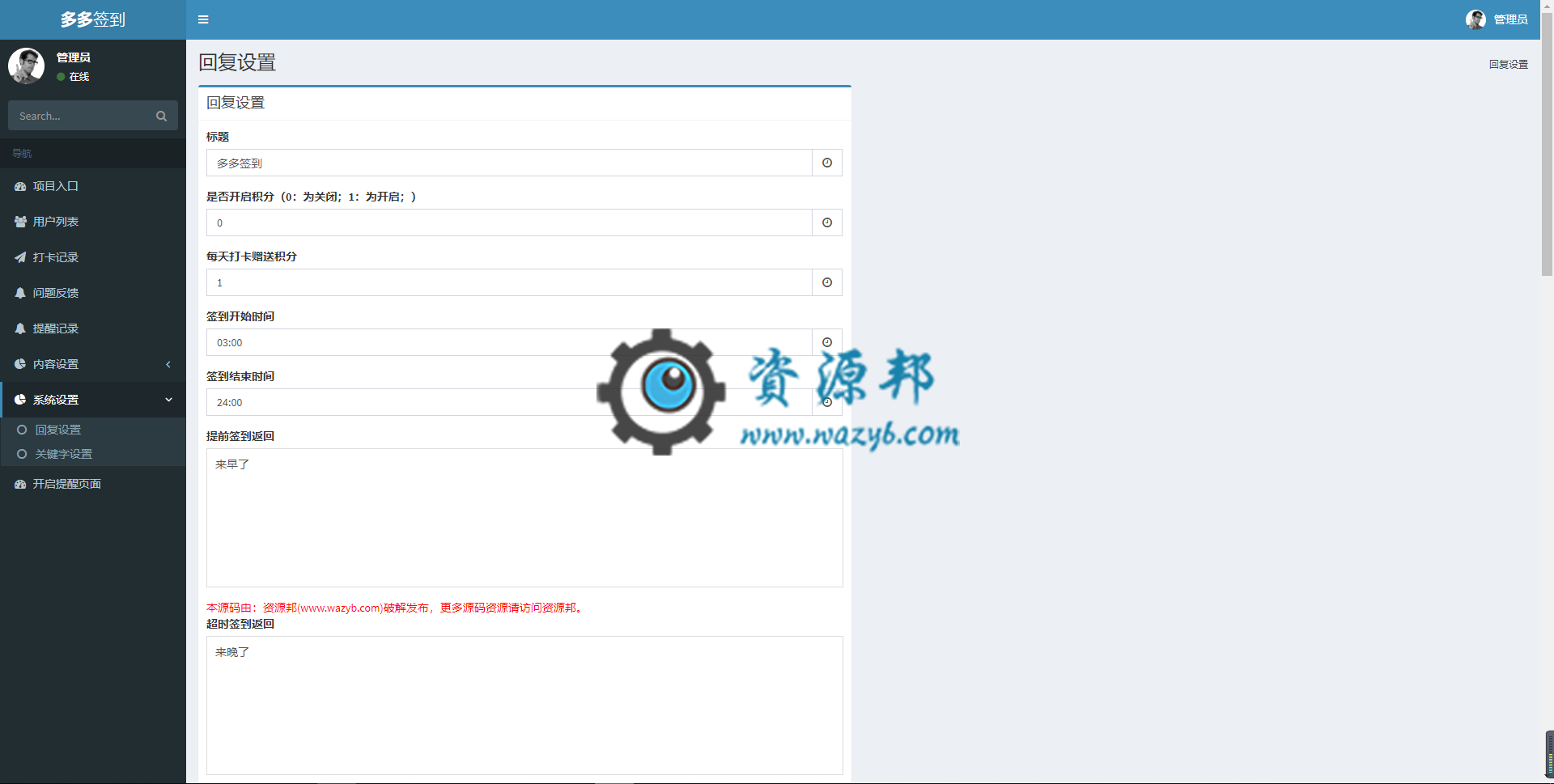 8、可自定义打卡图片、文字,可设置签到关键字回复