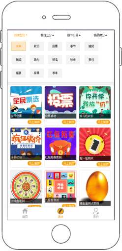 活动支持手机端、后台富文本编辑、虚拟人气、自定义图片、文本、标题框图片、背景音乐、动态特效、图标、生成二维码等,各个活动底部自定义引导语链接,炮灰域名,关注公众号开关。