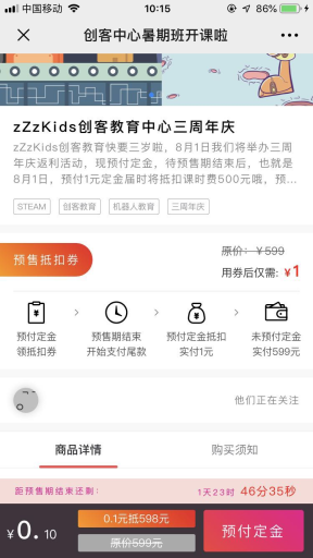 2、预售期结束,系统会自动抵扣课程价格,而没有预付定金的用户则需要原价购买;
