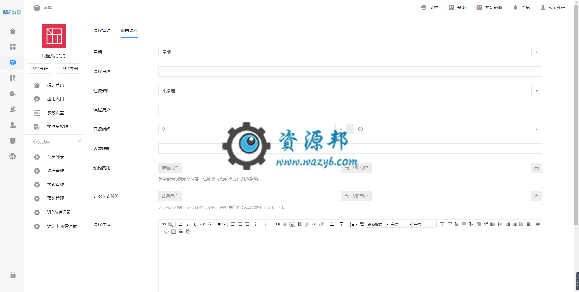 课程管理:后台支持切换课程循环周期,可按周循环或按月循环,避免繁杂的课程管理,简单便捷除了自定义课程名称、简介、开课时间、课程详情外,更支持了预约人数限制功能与任课教师绑定功能,预约人数达到设定值将不再