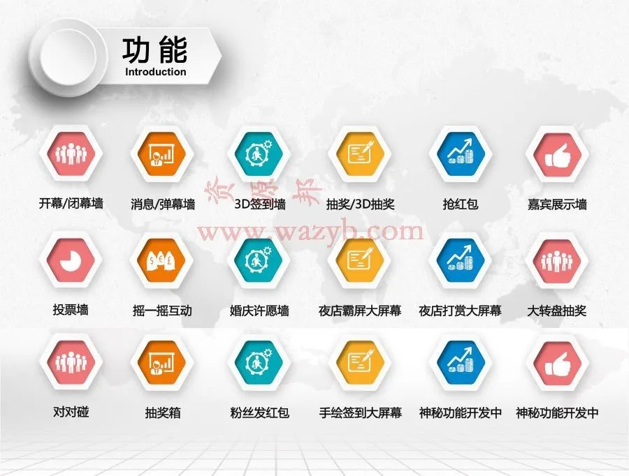 1、本模块支持开幕墙、闭幕墙、消息墙、二维码扫描墙、3D签到墙(支持logo签到和文字签到)(4种展示效果)、多奖品切换现场抽奖、酷炫互动疯狂抢红包、嘉宾墙等,后续将再新增多个墙,敬请期待;