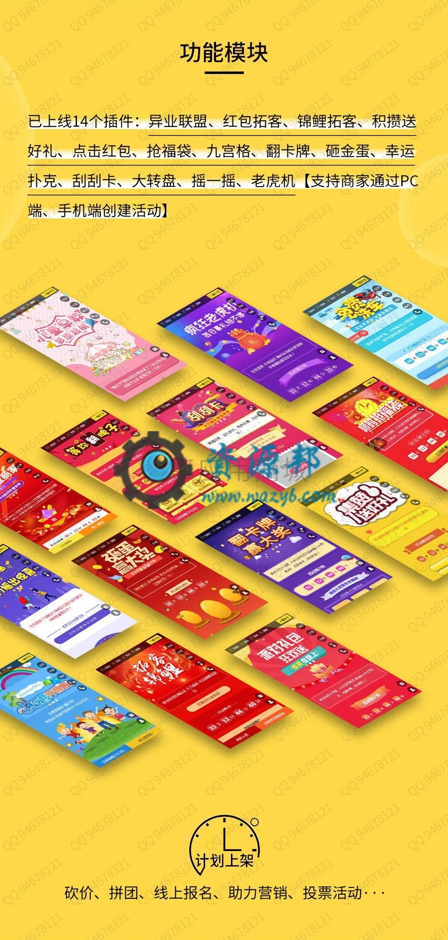 已上线 14 个插件:异业联盟、红包拓客、锦鲤拓客、积攒送好礼、点击红包、抢福袋、九宫格、翻卡牌、砸金蛋、幸运扑克、刮刮卡、大转盘、摇一摇、老虎机【支持商家通过PC端、手机端创建活动】