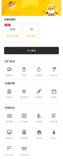 会赚钱的机器人,你要以为这是/一只普通的机器狗,那就大错特错。这是/一只十足的旺财,会赚钱的去机器人,可直接在公众号出售机器人服务(按时长收费)。
