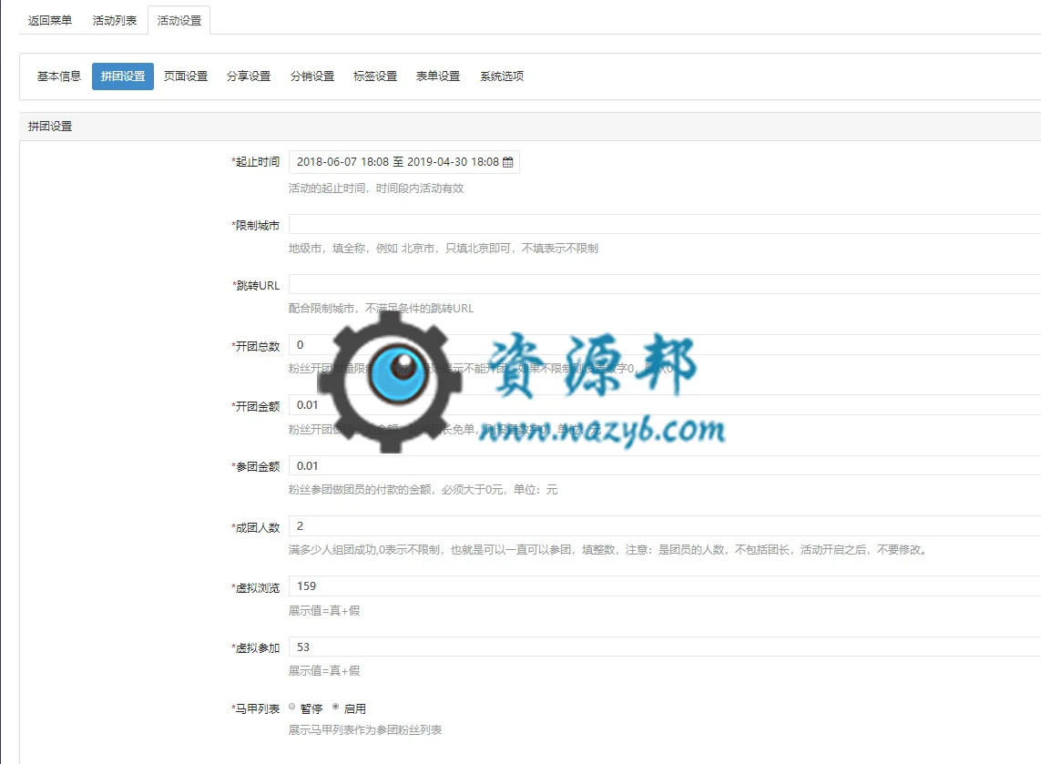 1、支持后台子账号在同一公众号内自行开展活动,具体方式:自行注册或者新增微擎账号,在使用者管理处添加为操作员身份,然后勾选设置拼团的活动管理权限即可。