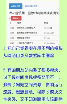 2.有的朋友站内装了很多模块,过了段时间发现很多又用不上,浪费了网站空间资源,影响运行速度,想想删除,可除了模块文件夹外,又不知道哪里应该删除。